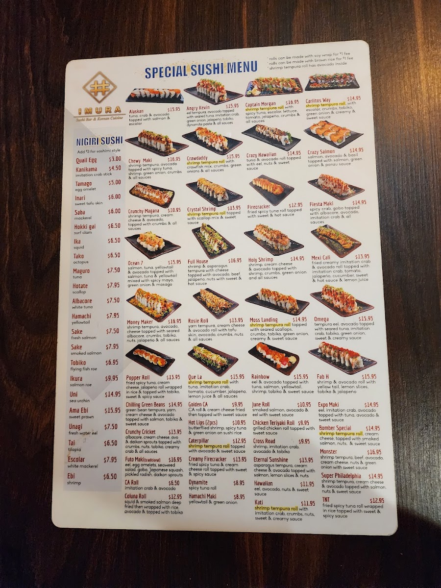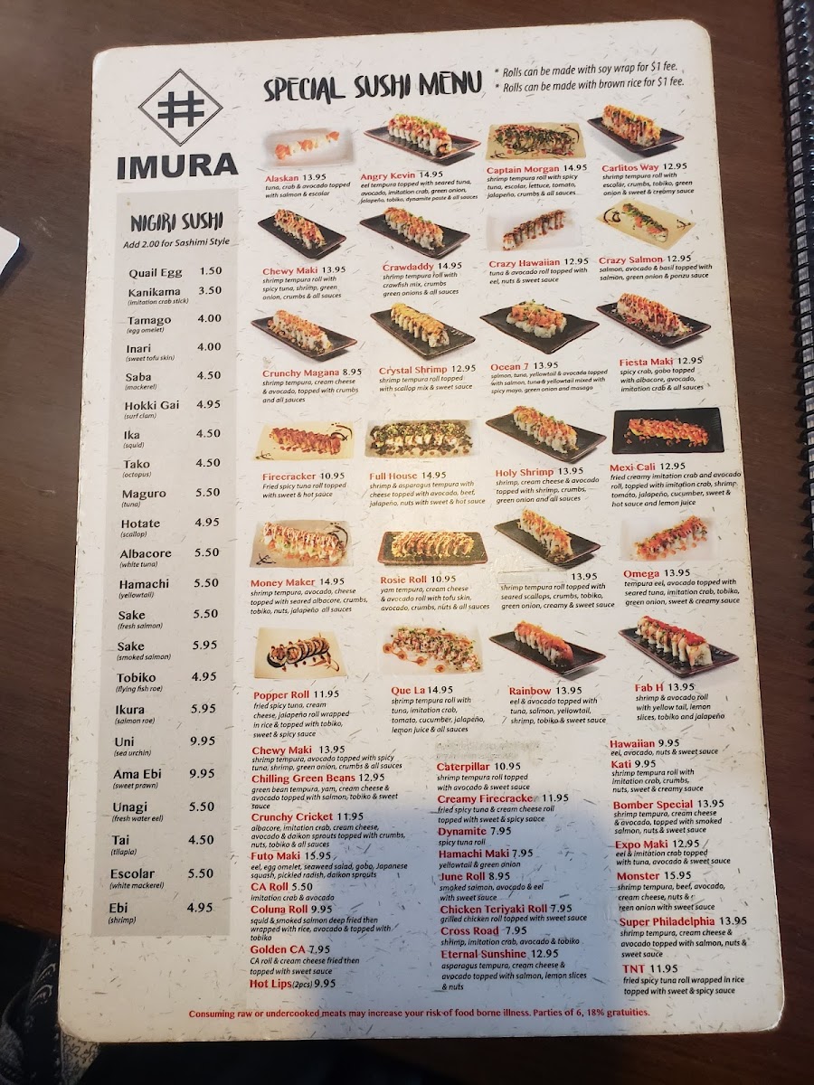 When you step into Imura Japanese Restaurant, you're greeted with an inviting atmosphere and a menu full of authentic Japanese flavors. The Imura Japanese Restaurant Menu offers a diverse selection of traditional dishes, from perfectly seasoned sushi rolls to hearty bowls of ramen. Whether you're craving fresh sashimi or something more substantial like teriyaki chicken, there's a delightful variety to satisfy any appetite. For those who love a little adventure, there are also specialty dishes that showcase the chef’s creativity. Each dish is made with the finest ingredients, ensuring a dining experience that’s both fresh and flavorful. The menu strikes the perfect balance between classic favorites and exciting new flavors, making it the perfect place for a casual meal or a special gathering with friends and family.